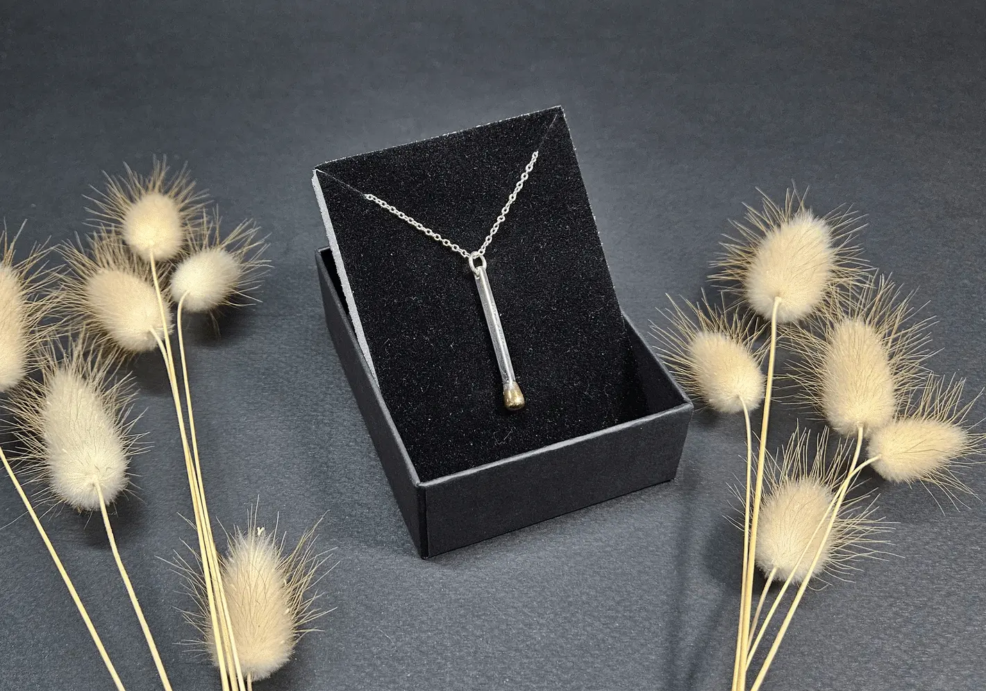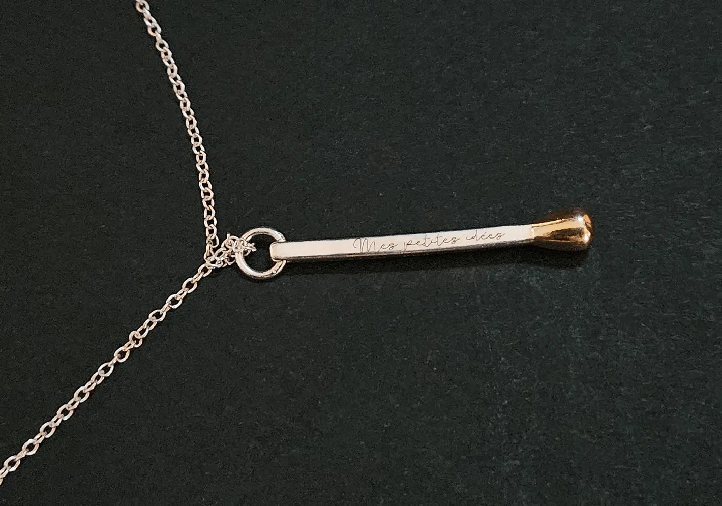Ce pendentif allumette, à la fois sobre et moderne, s’adapte à toutes les personnalités. Sa silhouette fine et minimaliste en fait un bijou élégant qui se porte aussi bien seul qu’associé à d’autres colliers. Livré dans sa boîte, il est prêt à être offert. Que ce soit pour marquer un anniversaire, célébrer une histoire d’amour, ou simplement pour garder un souvenir près de vous, ce collier est une idée cadeau pleine de symbolique.